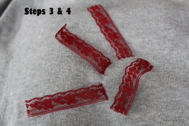 Step 1. Cut 4 strips of each color lace/seam binding to desired lengths, you may want to vary the lengths to add some character to your flowers. I'm adding five flowers, so I have 20 pieces of lace.